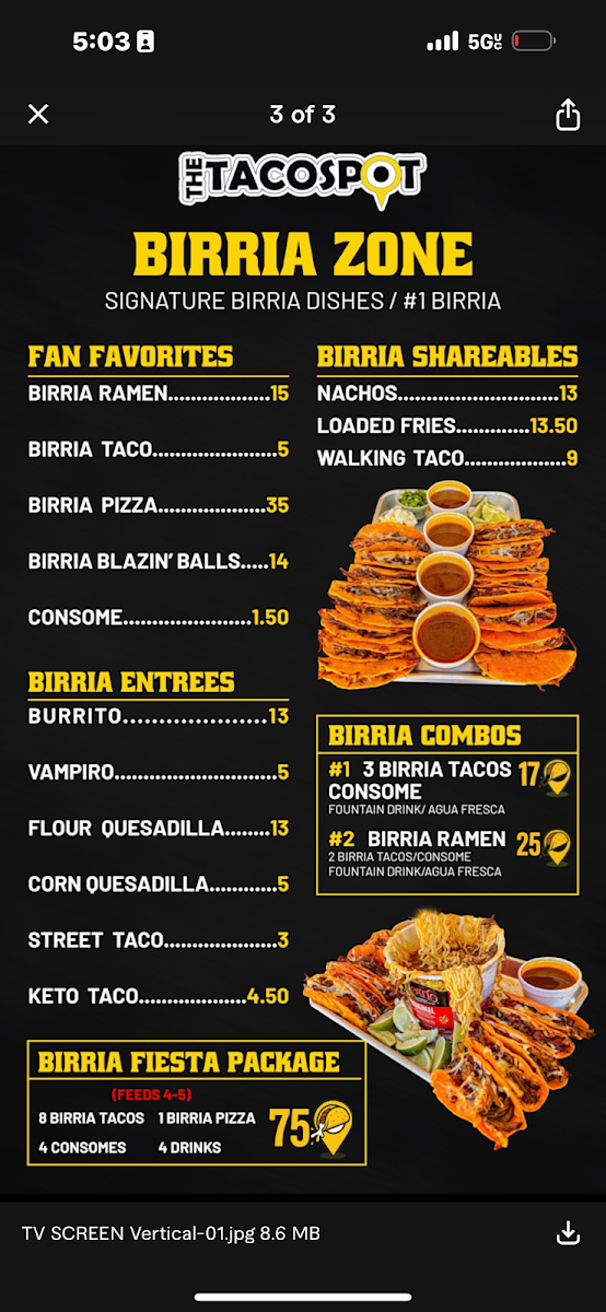 “ This taco birria place is awesome! The tacos are super tasty, with soft meat that’s really good. They give you a tasty broth to dip the tacos in, which makes them even better. The tortillas are fresh and yummy. It’s a nice spot to hang out with friends. You gotta check it out! ”